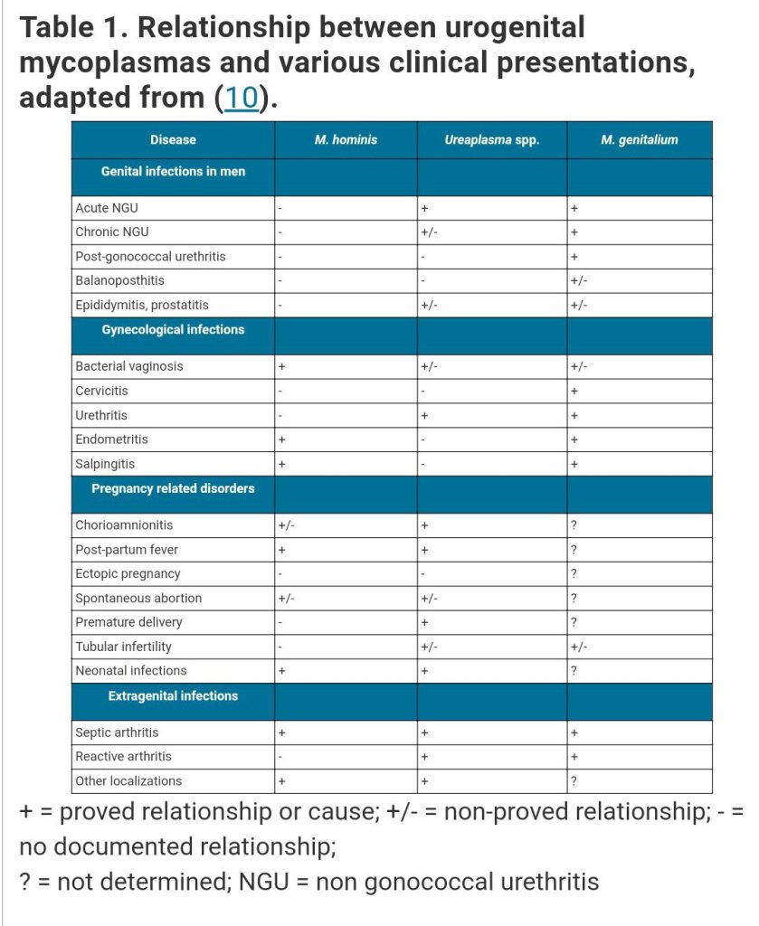 Four genital mycoplasmas, Mycoplasma hominis, Mycoplasma genitalium and Ureaplasma spp. have been associated with a large variety of illnesses but have been demonstrated as a cause only for a few clinical conditions (58).