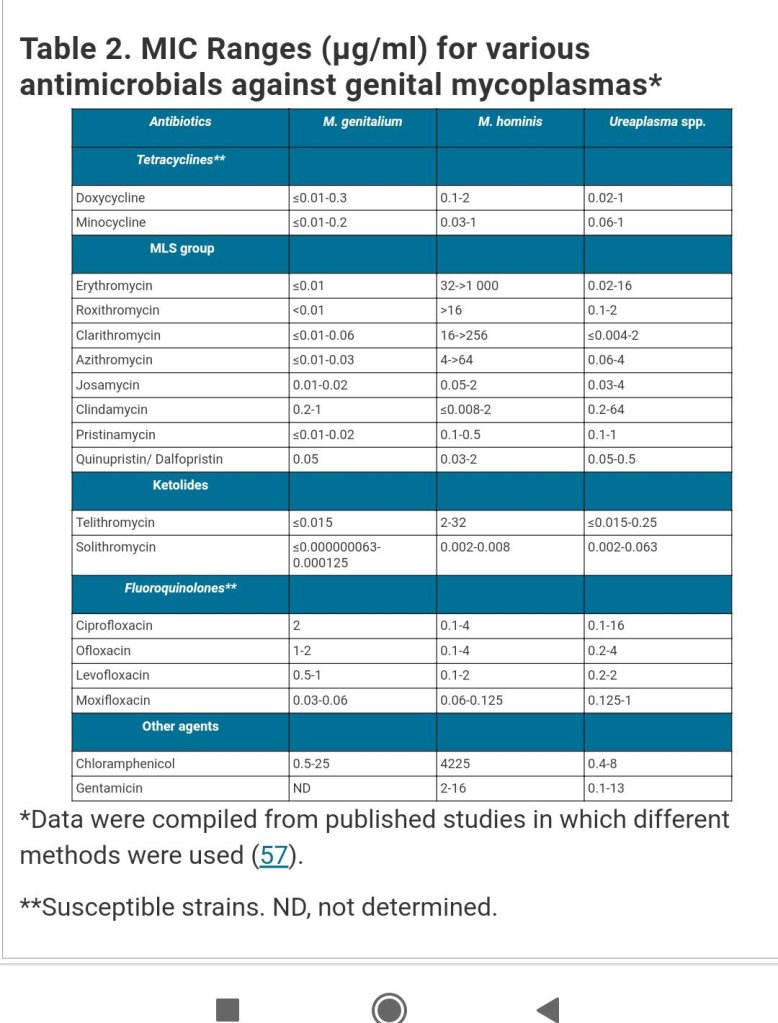 The in vitro susceptibility of M. hominis, M. genitalium and Ureaplasma spp. is shown in Table 2.